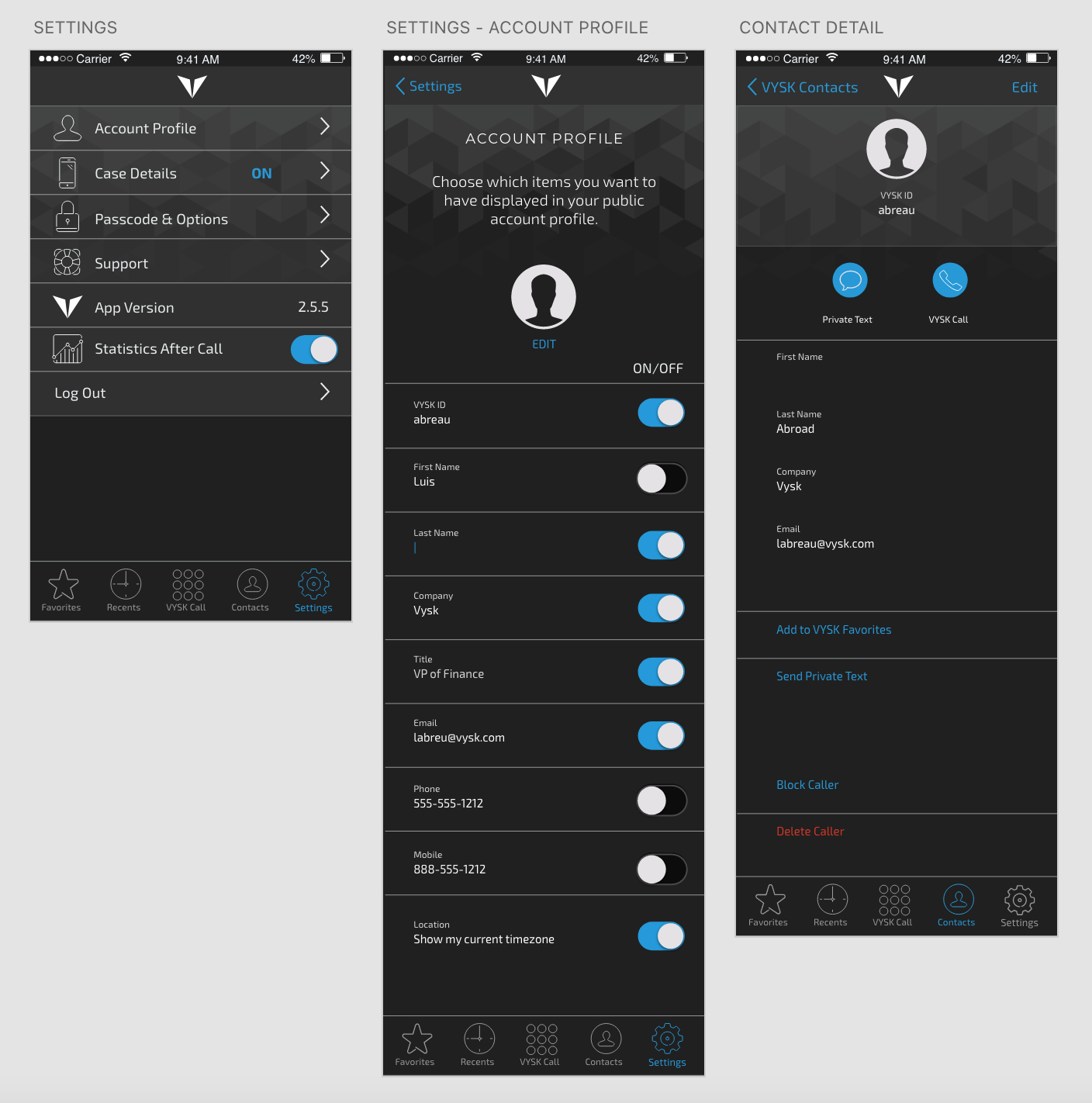 With the changes to the account setup and device activation, we still needed to account for devices in the field that were grandfathered in so that there was no disruption to the product's functionality. We updated the calling screens and the "dialer", replacing the dialer with the VYSK Call feature. The iterative release allowed for both contact to contact functionality as well as a number dialer for GEN 1/MVP devices. Taking this approach allowed for less disruption to the user experience for existing users while incorporating new functionality until the older devices could be retired.