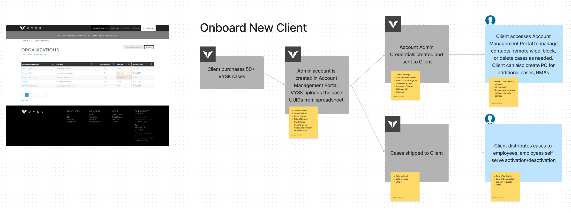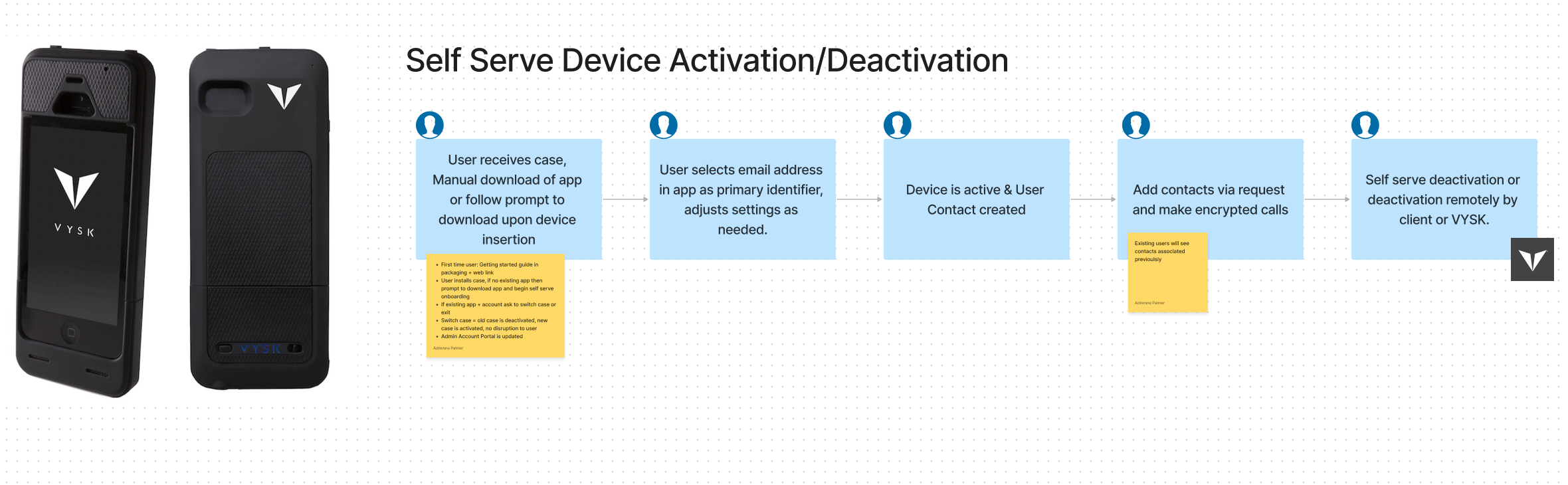 Some of the challenges in pairing a hardware device with a mobile app was in the account creation, device activation and deactivation, and other on boarding and set up activities. Prior to joining VYSK the activation and on-boarding process was complicated, required a lot of manual effort for the client and end user, and also required multiple touch points for internal VYSK administrators.
