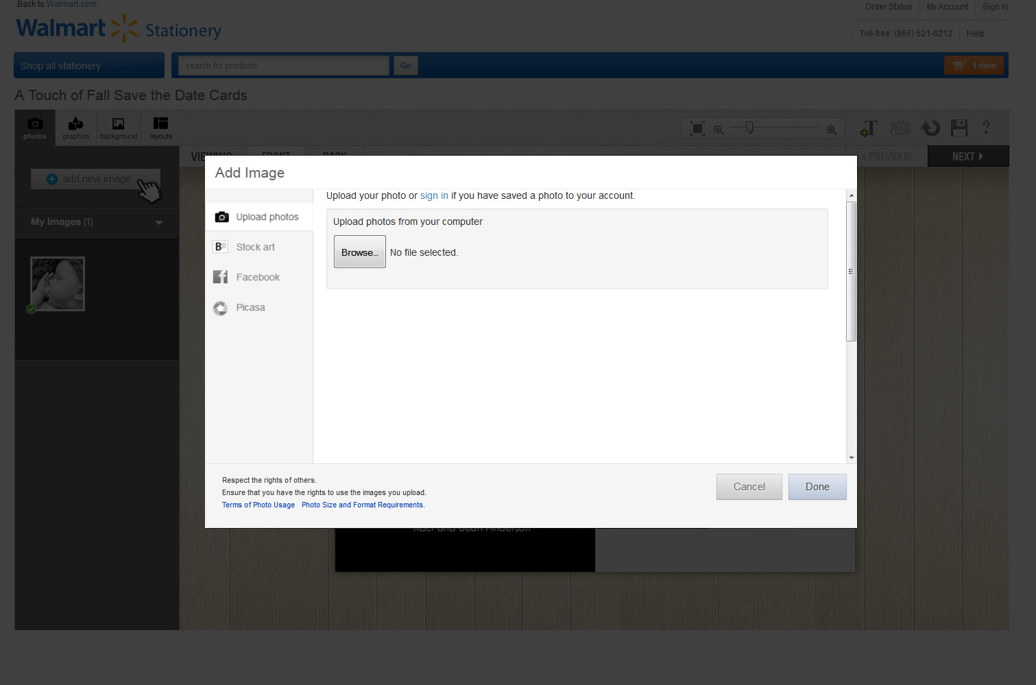 Photo cards have a few more menu items and functionality available for customization. Uploaded images are saved in a users' library. This allows for users to log in with other devices to upload images that are stored locally.